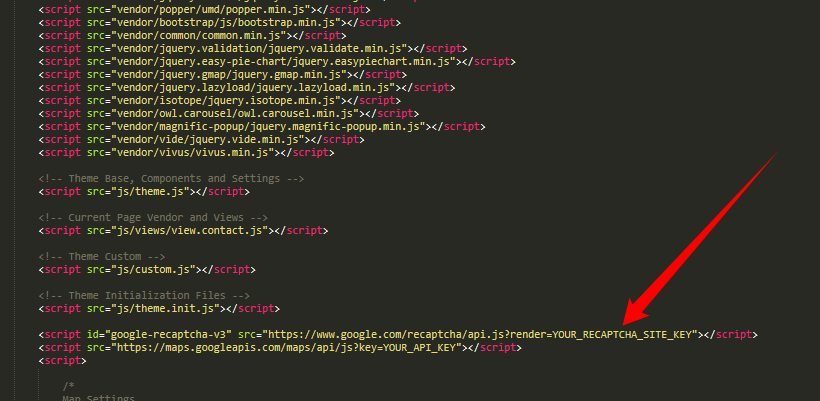 7) Add the script of Google Recaptcha v3 on footer of document and replace "YOUR RECAPTCHA_SITE_KEY" with your recaptcha site key. Like the image below: